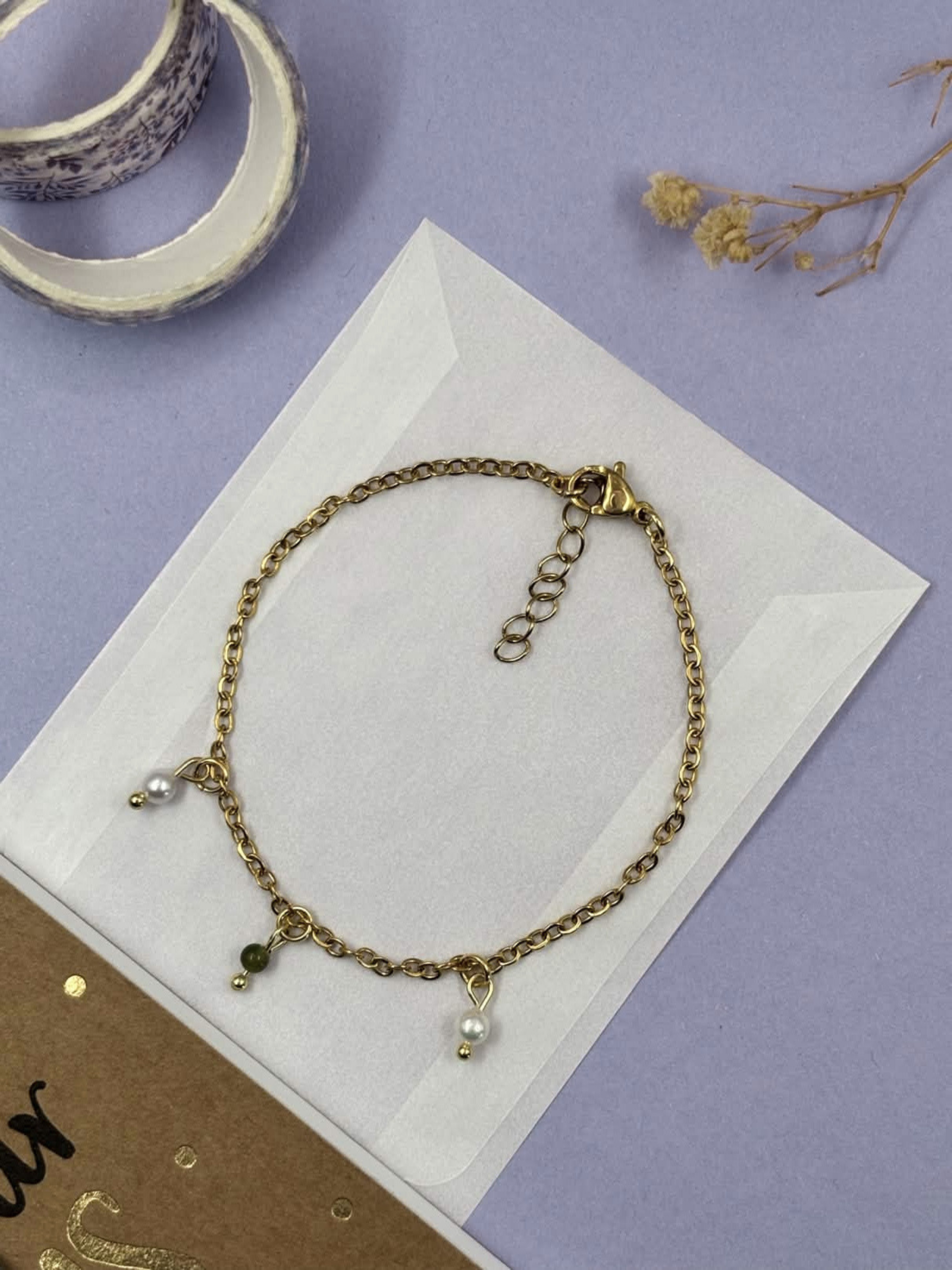 Materials: 18 karat gold-plated 316 stainless steel and 18 karat gold-plated 304 stainless steel extension chain. With, real White Baroque rice freshwater pearls and Nephrite Jade.
