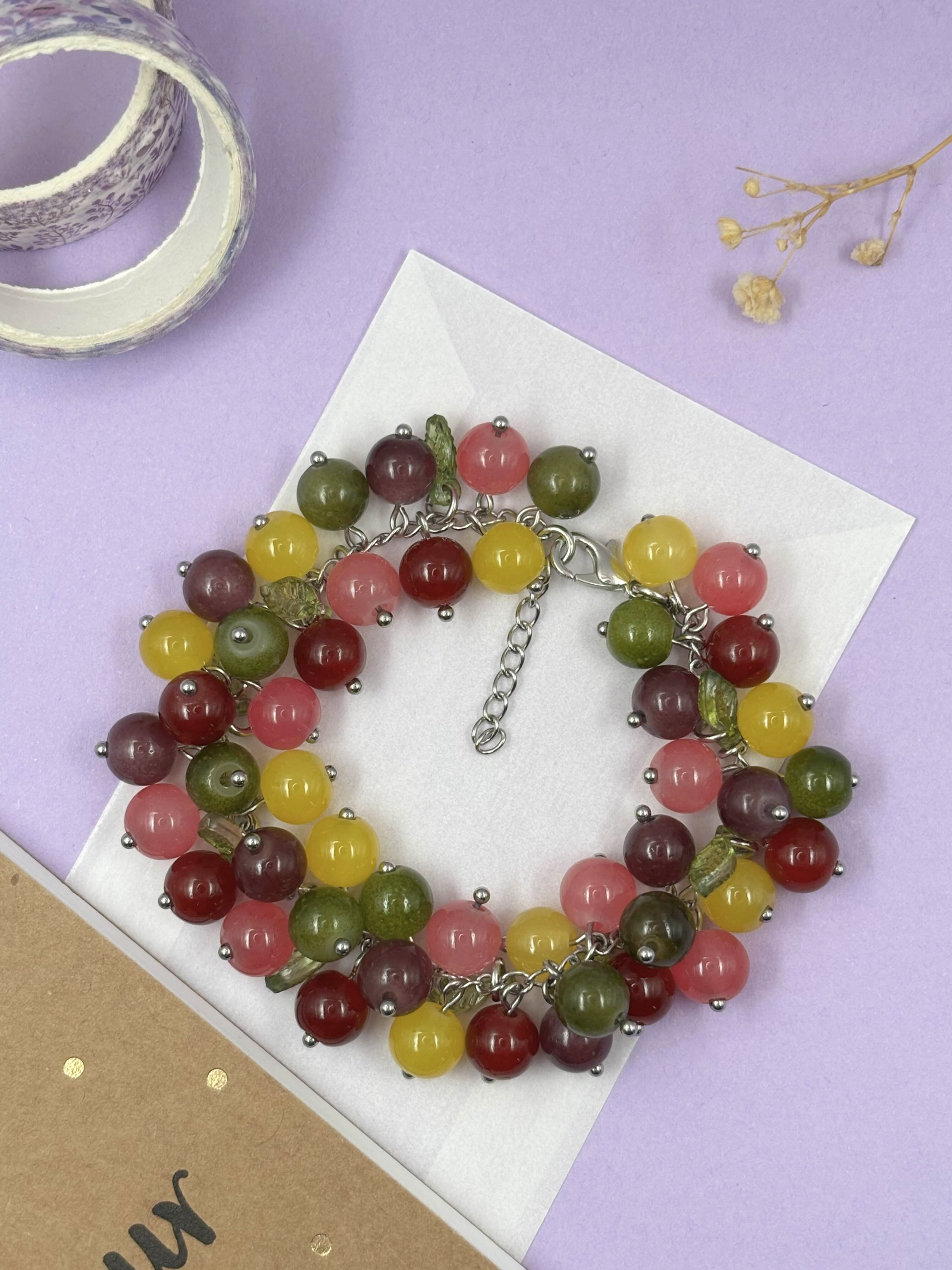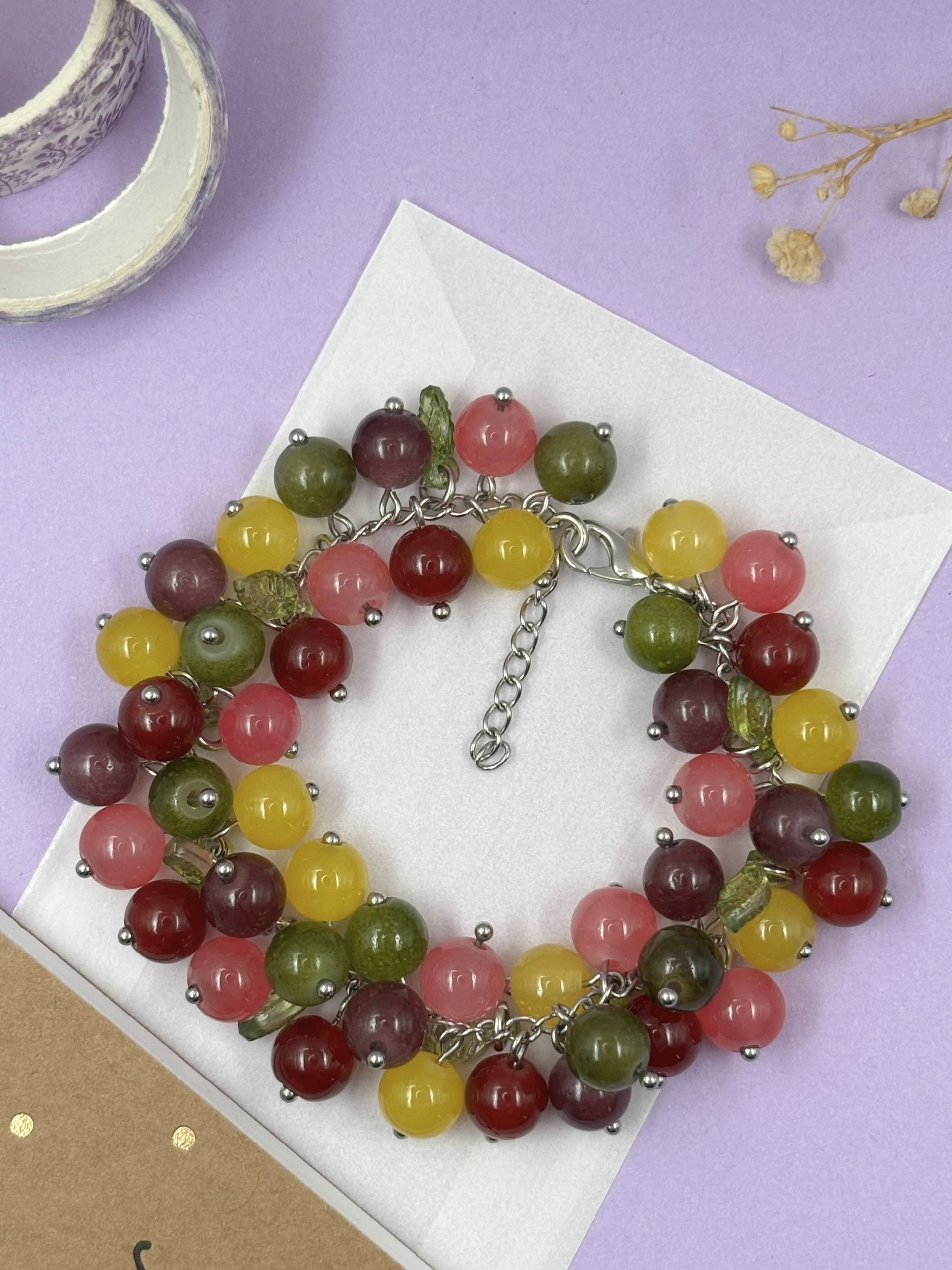 Falling leaves, cosy vibes. This autumn-inspired cluster bracelet blends rich glass beads in warm tones—think burnt orange, deep red, and golden amber—finished with delicate leaf beads for a seasonal touch. It’s like a little piece of fall you can wear every day.