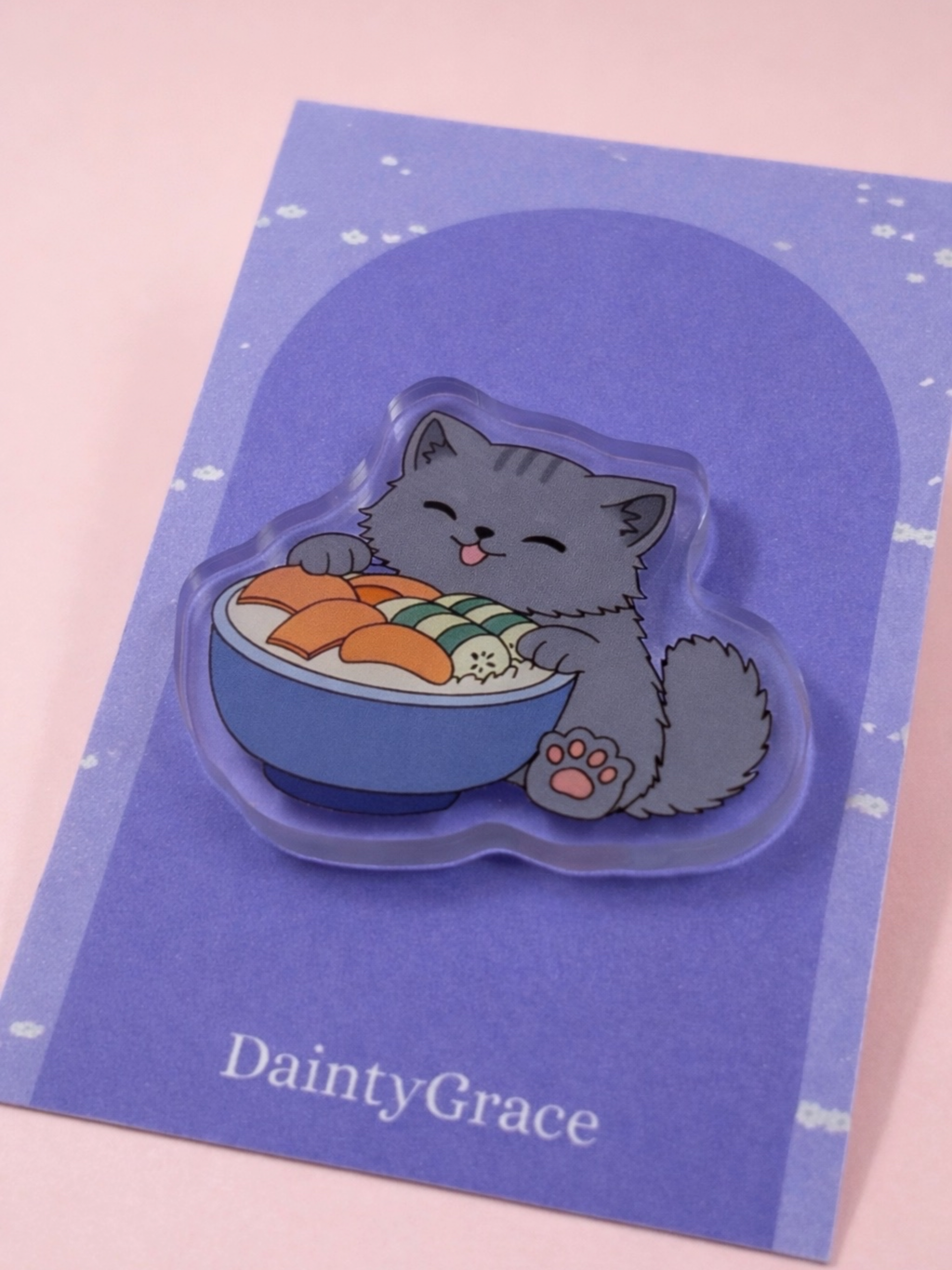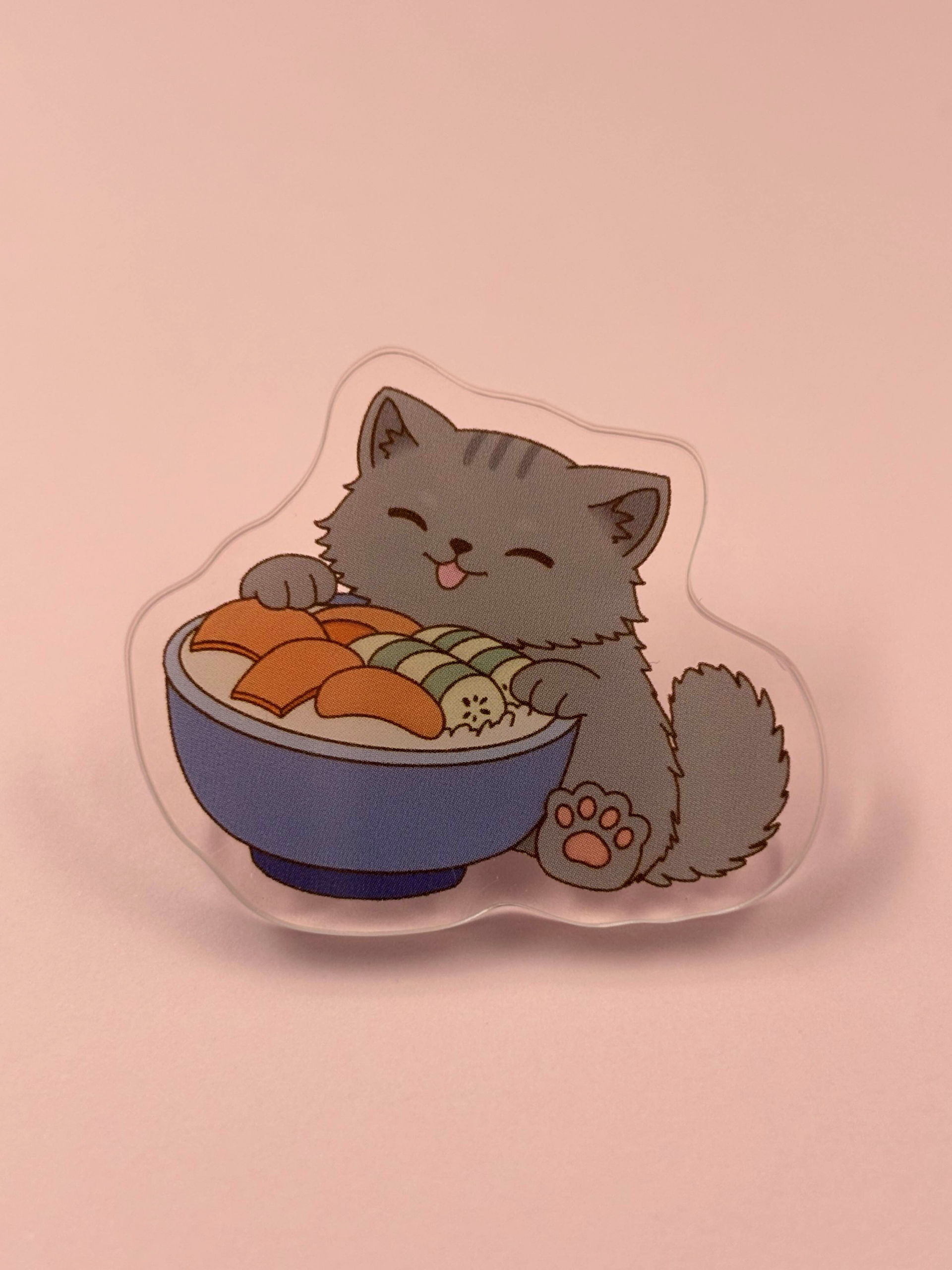 The Cat With Sushi Bowl Acrylic Pin is part of the Oh, Toe Beans Collection.