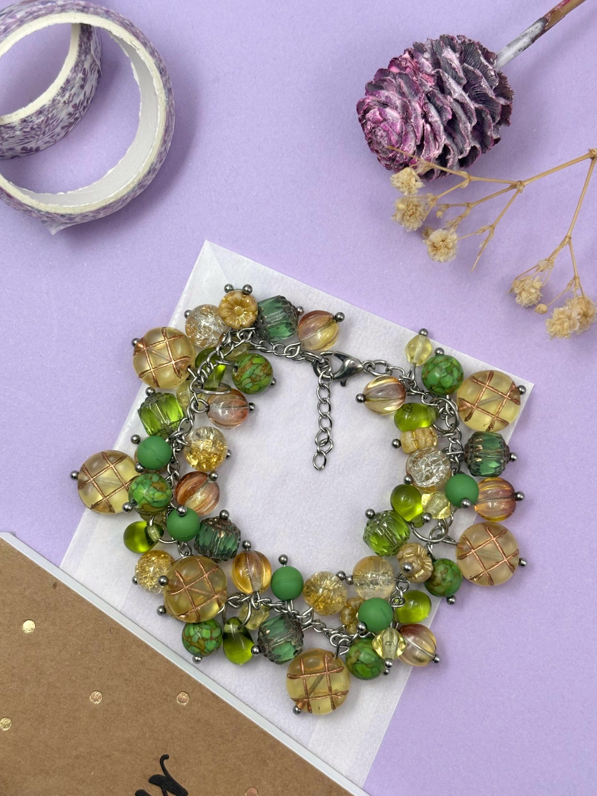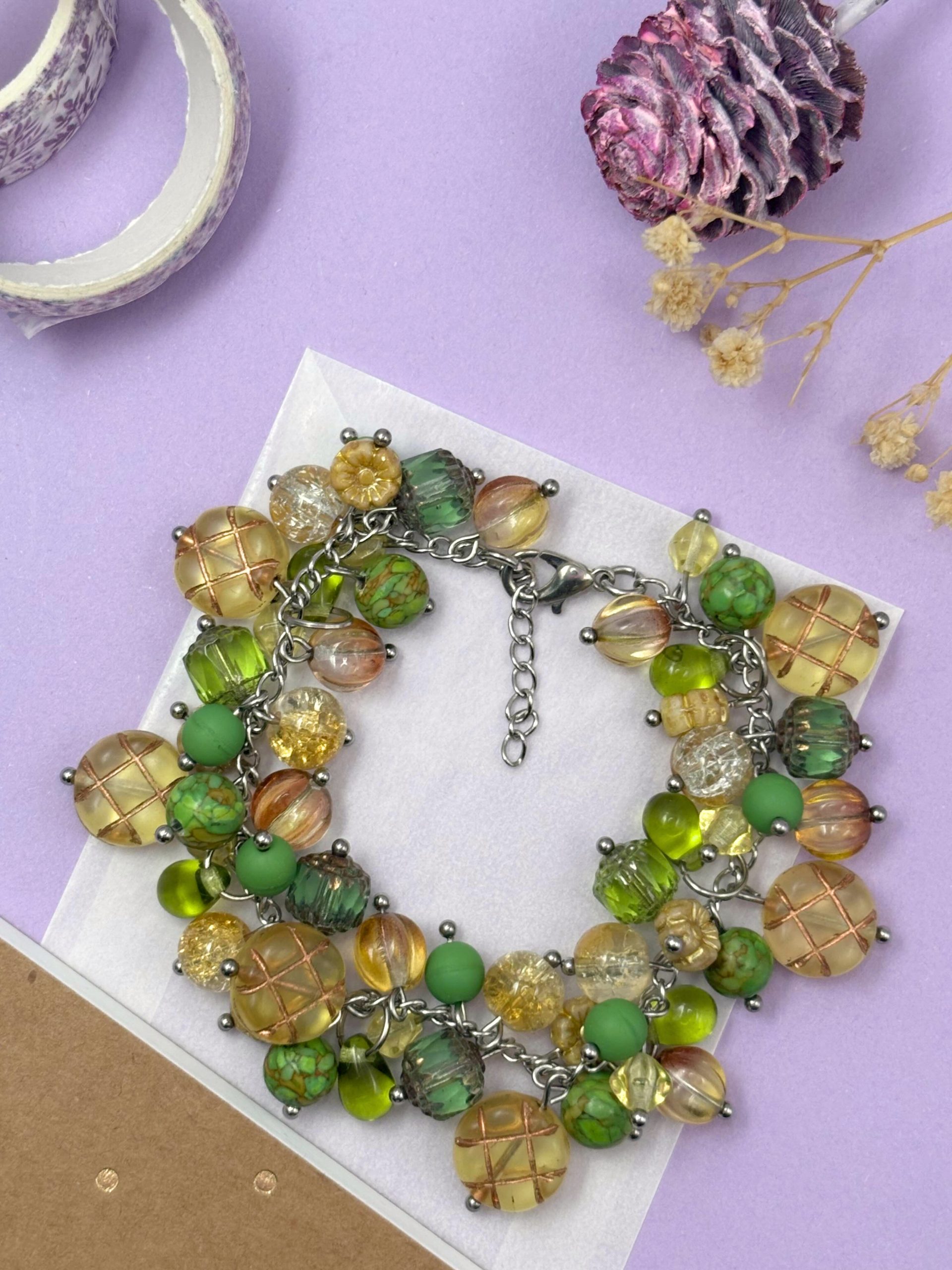 The Green and Amber Toned Cluster Bead Bracelet is part of the Maples Meadow Collection.