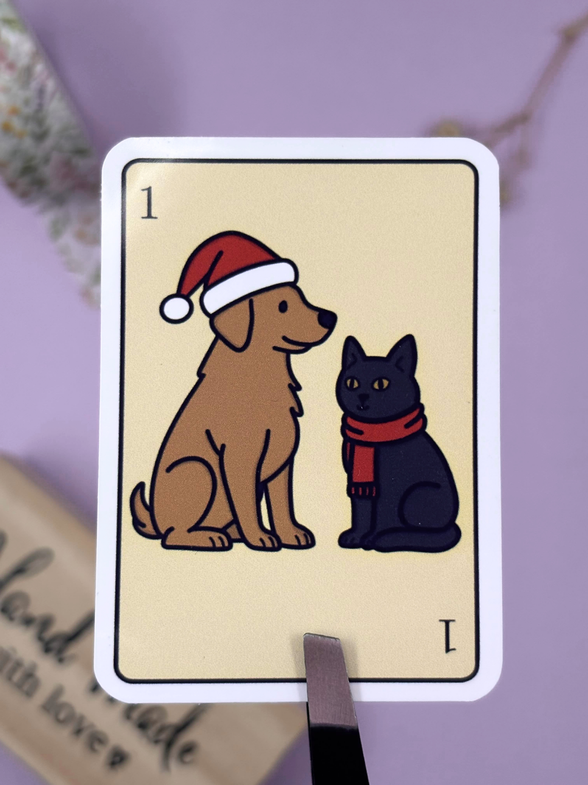 Add a cosy seasonal touch to your belongings with this Merry Pair Ace Inspired Card Sticker. Featuring a festive dog and cat duo in a charming card-style design, it brings warmth and winter cheer to any surface.